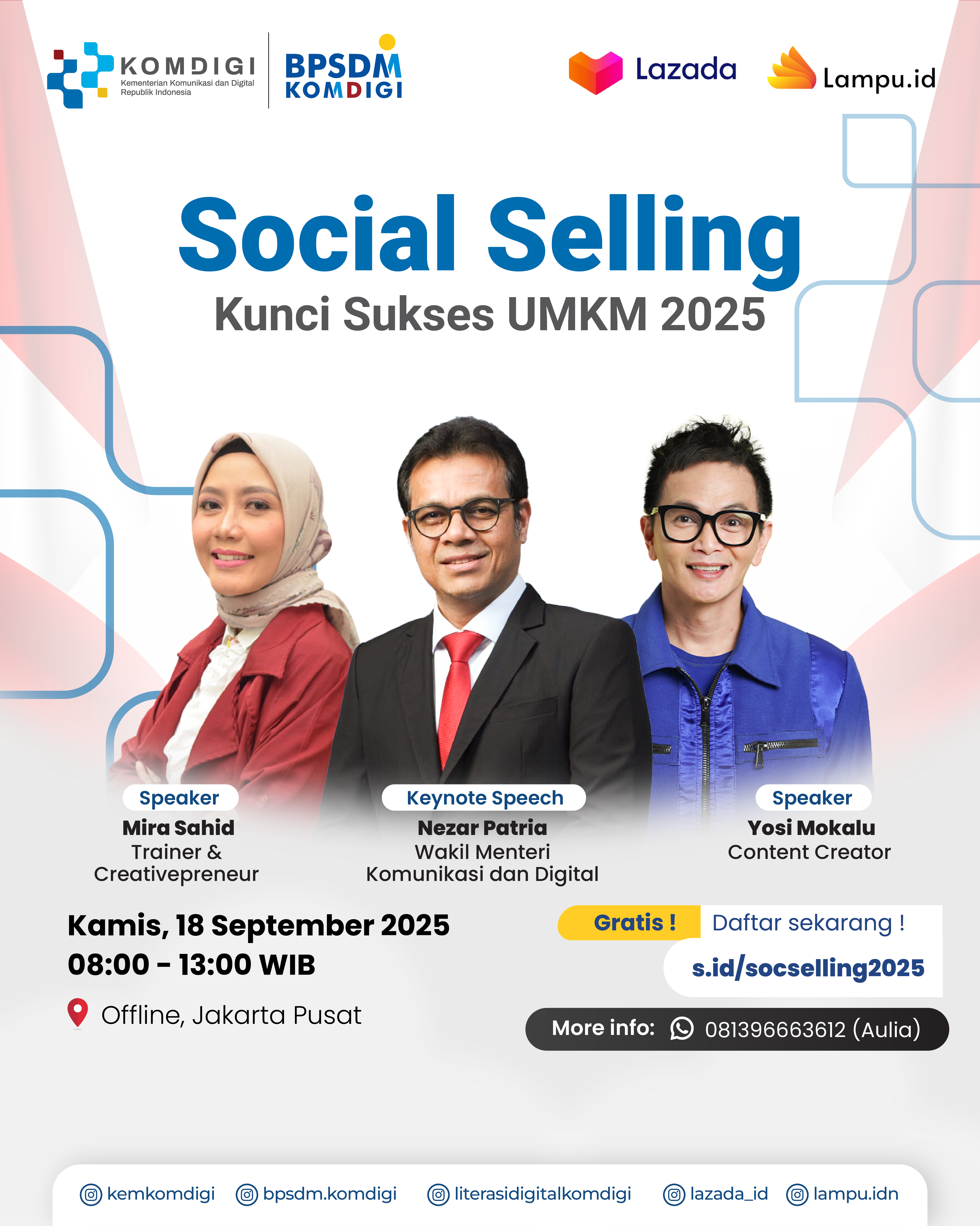Kegiatan Mendatang: “Social Selling: Kunci Sukses UMKM 2025” Sebuah inisiatif kolaboratif dari Kementerian Komunikasi dan Digital, bersama Lazada Indonesia dan Lampu.id, untuk memberdayakan UMKM agar sukses melakukan scale-up dan tetap kompetitif di era digital yang terus berkembang.